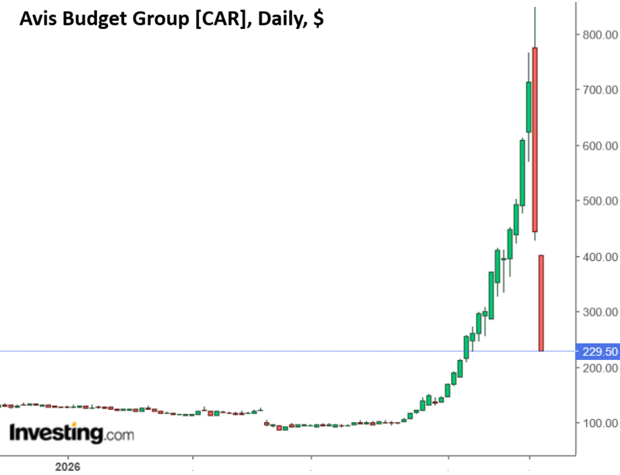 Avis Budget Group, an oldline rental-car stock in an inglorious tough business that had turned into a hedge-fund-driven meme-stock and had exploded by 770% since early March, has collapsed by 72% in about 26 hours, from the ridiculous intraday high of $847 yesterday morning to the still ridiculous $229 currently, as the massive hedge-fund powered meme-stock dynamics that had created an even more massive hedge-fund short-squeeze unwinds.