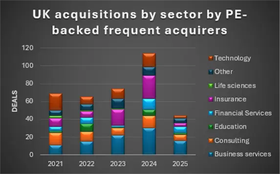 The findings are based on data from Inven, a private deals database, and represent a screened cohort of active UK mid-market consolidators rather than the whole private equity market. Within that group, the numbers show that while overall buy-and-build activity retreated sharply after an exceptionally busy year, business services, consulting and financial services were the most resilient parts of the market.