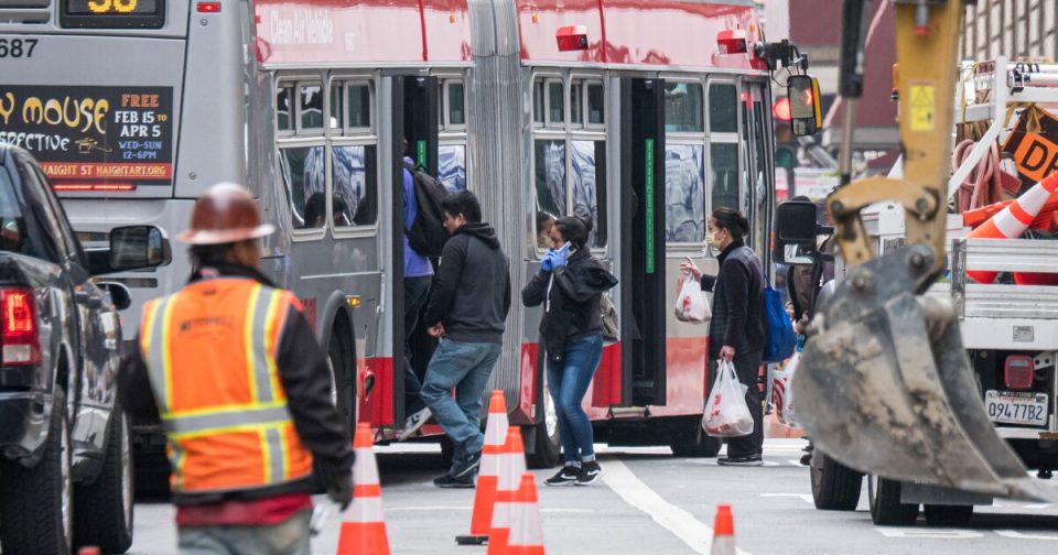 Passengers board a transit bus in San Francisco