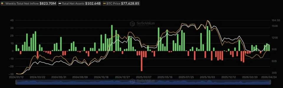 Wu Blockchain reported on April 27 that spot Bitcoin ETFs recorded net inflows of $824 million in the week of April 20 to April 24, extending their streak of net inflows to four weeks.