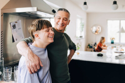 A dad with his arm around his son who has a disability, with the mom in the background on a laptop. (CNW Group/The Empire Life Insurance Company)